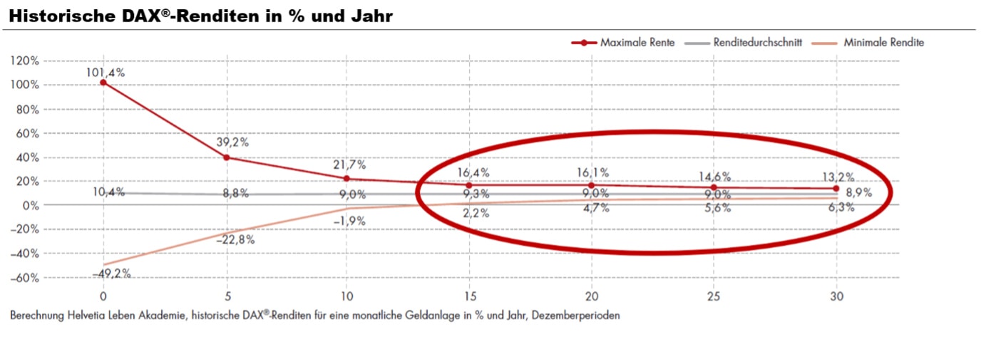 Bei den historischen DAX®-Renditen wird deutlich, dass eine längere Anspardauer ab 15 Jahren keine negativen Renditen hervorbringt – optimale Aussichten für die Altersvorsorge.