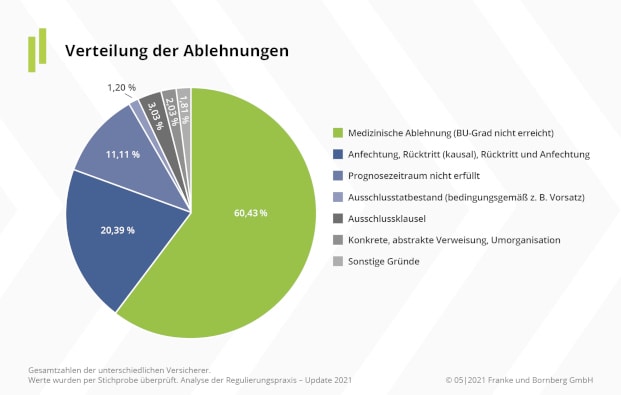 Wenn es zu einer Ablehnung kommt, dann hat das laut Franke und Bornberg in mehr als der Hälfte der Fälle (60 Prozent) den Grund, dass der vertraglich vereinbarte BU-Grad nicht erreicht wurde. „Überproportional hoch ist die Ablehnungsquote bei jungen Erwachsenen. Fast die Hälfte aller Ablehnungen wegen Verletzung der vorvertraglichen Anzeigepflicht werden gegenüber Versicherten bis 35 Jahre ausgesprochen“, berichtet das Analysehaus.