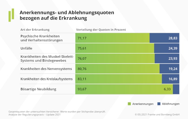 Die Anerkennungsquote variiert der Studie zufolge je nach Art der Krankheit. Während bei Krebs („bösartige Neuerkrankung“) mehr als neun von zehn Entscheidungen zugunsten der Versicherten ausfallen, beträgt die Positivquote bei psychischen Erkrankungen, dem BU-Auslöser Nummer 1, nur 71 Prozent. Krankheiten des Nervensystems wie Parkinson oder Multiple Sklerose führen immerhin in vier von fünf Fällen zur Anerkennung.