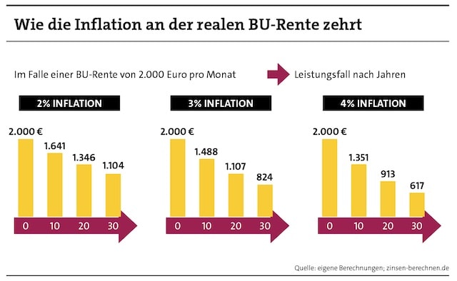 Wie stark die Inflation speziell die Berufsunfähigkeitsrente anknabbert, veranschaulicht dieses kleine Rechenbeispiel: Wie viel ist eine BU-Rente von 2.000 Euro in zehn Jahren wert, bei einer jährlichen Inflation von 2 Prozent? Nun, die Kaufkraft würde dann nur noch so hoch liegen, als würde man heute 1.641 Euro statt 2.000 Euro vom BU-Versicherer kassieren (siehe Grafik unten).