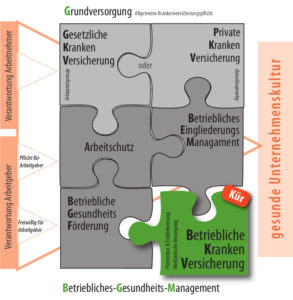 Dazu muss zunächst der Begriff BGM klar definiert sein. Fakt ist: Ein Obstkorb oder ein einmaliger Aktionstag macht noch kein Gesundheitsmanagement aus. Oft findet man in Betrieben isolierte Einzelmaßnahmen für die Themenfelder Bewegung, Ernährung und Rücken. Natürlich haben die ihre Berechtigung. Meist klagen BGM-Manager aber über sehr niedrige Teilnahmequoten. Das Angebot verpufft, und dadurch wird viel Geld verbrannt. Ganz anders ist es mit der betrieblichen Krankenversicherung. Sie erweist sich als erlebbare Gesundheitsleistung und ist bei Arbeitnehmern extrem beliebt. Als nachhaltiges Benefit ist sie als freiwillige, zielgerichtete Maßnahme der betrieblichen Gesundheitsförderung einzuordnen. Die bKV ist somit die Kür, oder sogar „die Revolution der betrieblichen Gesundheitsversorgung“, wie ich meinem Fachbuch zur bKV getitelt habe. Für die Einordung der bKV in unser Gesundheitssystem verwende ich folgende Grafik, die deren Relevanz veranschaulicht.