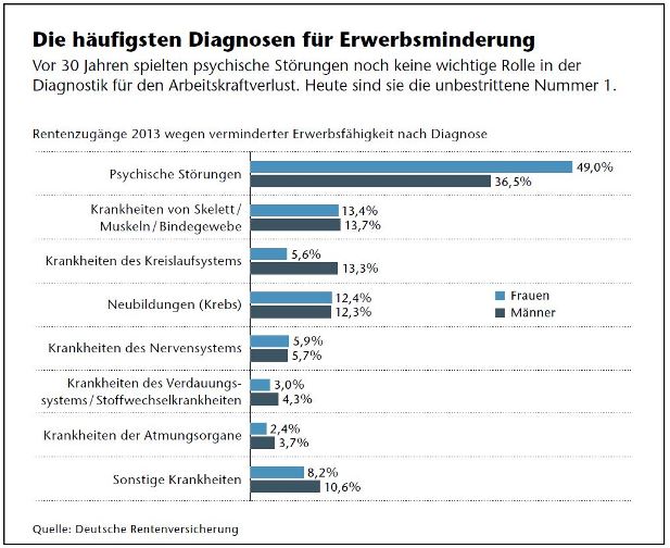 Nach Berechnungen der Deutschen Aktuarvereinigung liegt die Wahrscheinlichkeit, vor Renteneintritt mit 65 Jahren berufsunfähig zu werden, bei 20- bis 50-jährigen Männern je nach Alter zwischen 34 und 43 Prozent. Hauptgrund hierfür sind mit großem Abstand psychische Störungen: Sie sind bei nahezu jeder zweiten Frau die Ursache für eine verminderte Erwerbsfähigkeit, bei Männern liegt die Quote bei 36,5 Prozent.