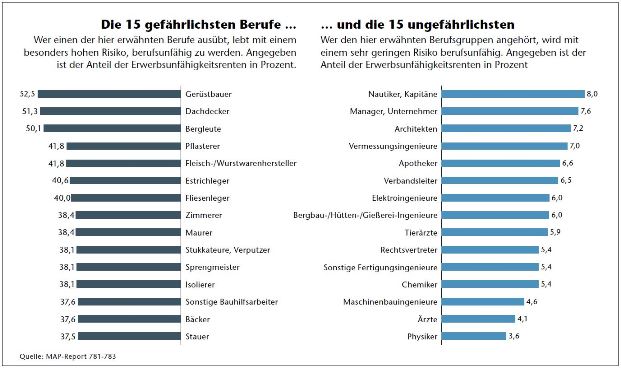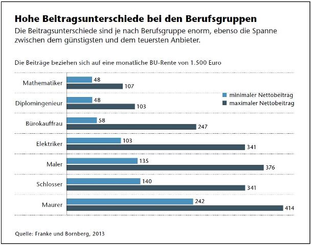 Je nach Berufsgruppe ist das Risiko für den Eintritt einer Berufsunfähigkeit unterschiedlich hoch. So ist rund jeder zweite Dachdecker statistisch gesehen von diesem Schicksal bedroht, aber nur etwa jeder 20. Jurist. Die unterschiedlichen Risiken führen naturgemäß zu enormen Unterschieden bei den Beiträgen: So zahlt ein Maurer, der mit einer Wahrscheinlichkeit von 38 Prozent berufsunfähig zu werden droht, monatlich je nach Anbieter mehr als 400 Euro für eine BU-Rente von 1.500 Euro, ein Diplomingenieur hingegen mit bis zu 130 Euro weniger als ein Drittel des Beitrags.