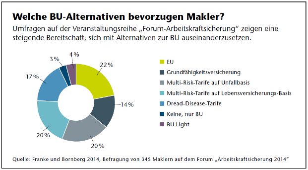 Auf der Vertriebsseite gewinnen die alternativen Produktlösungen an Attraktivität, so das Ergebnis von Umfragen, die das Analysehaus im vergangenen Jahr unter den Teilnehmern der Veranstaltungsreihe „Forum-Arbeitskraftsicherung“ durchführte: „2012 war nicht einmal jeder fünfte Makler bereit, sich mit Alternativen zur BU zu beschäftigen, mittlerweile trifft dies auf die Mehrheit zu“, so Bornberg.
