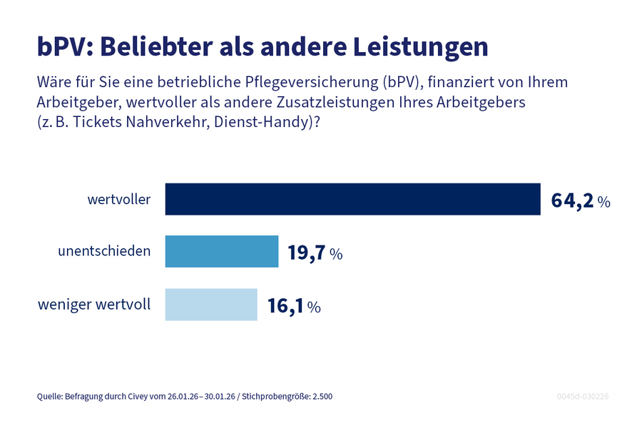 Um die Kosten für die Pflege in den Griff zu bekommen, wünschen sich die meisten Bürger Unterstützung von ihrem Chef: 76,3 Prozent der Beschäftigten in Deutschland würden es begrüßen, wenn ihr Arbeitgeber eine betriebliche Pflegeversicherung (bPV) zur Absicherung von Eigenanteilen im Pflegefall anbieten würde.