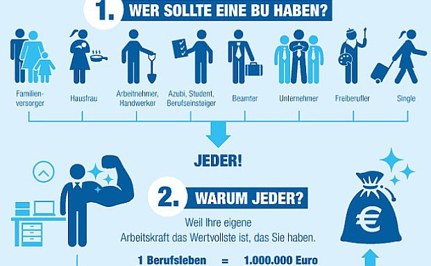 Die eigene Arbeitskraft ist das wichtigste Kapital überhaupt. Mit dem eigenen Einkommen zahlt man Miete, die Ausbildung der Kinder, den Urlaub, lieb gewonnene Hobbys und, und, und. Aber was, wenn das Einkommen plötzlich wegbricht, weil man nicht mehr arbeiten kann. Unsere Infografik der Woche fasst hübsch zusammen, warum sich eine BU-Versicherung für fast jeden lohnt.