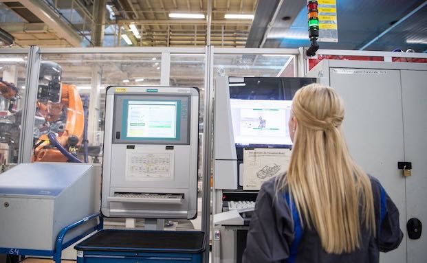 Eine Mitarbeiterin steht an einem Computer eines Schweißroboters im VW-Werk in Wolfsburg. Mit dem Betriebsrentenstärkungsgesetz soll die Attraktivität der Entgeltumwandlung für Arbeitnehmer erhöht werden.
