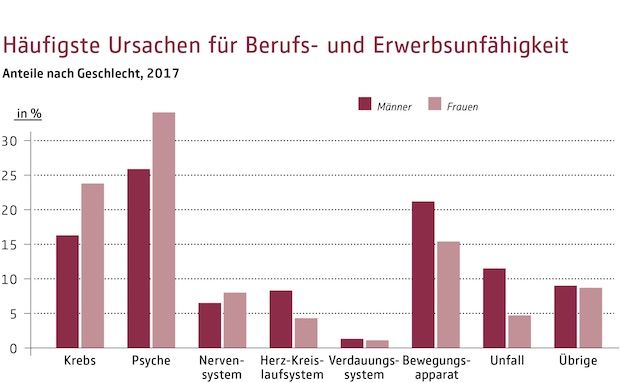 Dabei zeigen sich laut GDV große Geschlechterunterschiede, wenn es um die Ursachen für eine Berufs- oder Erwerbsunfähigkeit geht. Während bei jeder dritten Frau (34 Prozent) der Leistungsfall aufgrund einer psychischen Erkrankung eintritt, ist dies bei Männern nur in jedem vierten Fall so (26 Prozent).