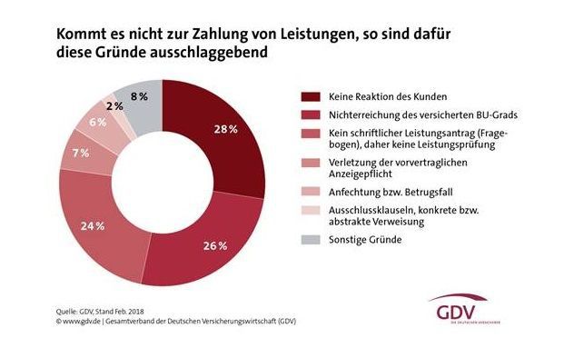 Wird ein Antrag abgelehnt, habe das hauptsächlich drei Gründe, berichtet der GDV. 28 Prozent der Versicherten brechen die Kommunikation mit dem Versicherer ab. 26 Prozent erreichen den vereinbarten BU-Grad nicht. Und 24 Prozent stellen keinen schriftlichen Antrag. Weitere 7 Prozent sind der vorvertraglichen Anzeigepflicht nicht nachgekommen, ein Gutachten beauftragen die Versicherer in knapp sechs Prozent aller Fälle. In rund 60 Prozent dieser Fälle führt das Gutachten nach Angaben des Verbandes dazu, dass im Sinne der Versicherten entschieden und Leistungen gezahlt werden.