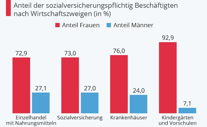 In der Corona-Krise halten vor allem Frauen den Laden am Laufen. Denn sie arbeiten zu großen Anteilen in den Berufen, die jetzt besonders gefragt sind. Wie die Statista-Grafik auf Basis von Daten der Bundesagentur für Arbeit zeigt, sind zum Beispiel jeweils über 70 Prozent der sozialversicherungspflichtig Beschäftigten im Lebensmittel-Einzelhandel, bei den Sozialversicherungen oder den Krankenhäusern Frauen. Zeit, um Danke zu sagen!