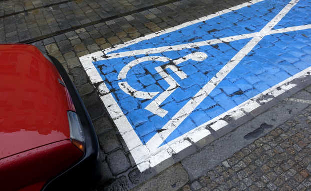 Ein rotes Auto parkt vor einer blauen Parkfläche, die als Parkplatz für Behinderte ausgewiesen ist: Wer wegen eines Unfalls oder einer Krankheit nicht mehr arbeiten kann, hat ein Einkommensproblem. Das kann sich mit einer BU-Versicherung lösen lassen.
