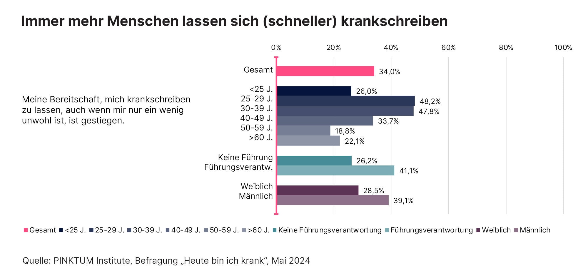 Demnach ist die eingangs erwähnte Neigung zum Krankmachen besonders unter Führungskräften (50 Prozent) und Männern (46 Prozent) verbreitet. Bei leichtem Unwohlsein würde sich jeder dritte Befragte heute schon krankschreiben lassen.