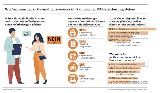 „Ein Vorteil für die Versicherer zeigt sich gerade im Hinblick auf die geringen Kontaktanlässe zum Kunden in der Lebensversicherung. Hier könnten Gesundheitsservices für Abhilfe sorgen, mit entsprechenden positiven Kundenerlebnissen. So kann der Lebensversicherer sich als Gesundheitspartner an der Seite seiner Kunden positionieren.“ Im Ernstfall erfahre der Kunde spürbare Mehrwerte von seinem BU-Versicherer und erhalte mehr als eine rein finanzielle Zuwendung.