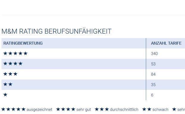 Den Analysten waren für ihr Rating neben der Bedingungsqualität der Tarife auch die Solidität, die Antragsfragen und die Kompetenz der Anbieter wichtig. Ungefähr eine Million Daten fließen laut M&M in das Rating ein.