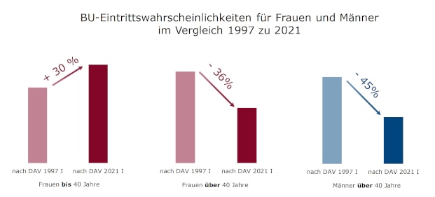 Tatsächlich zeigt die Überprüfung der DAV-BU-Tafel, dass die Wahrscheinlichkeit, berufsunfähig zu werden, teilweise sogar zugenommen hat. Das betrifft insbesondere junge Frauen unter 40 Jahren. Bei ihnen stieg das BU-Risiko in den vergangenen 20 Jahren um über 30 Prozent. Ein Grund hierfür sei die Zunahme von psychischen Erkrankungen in dieser Versichertengruppe, teilt die DAV mit. Bei jungen Männern sei die BU-Wahrscheinlichkeit hingegen stabil geblieben. Eine Erklärung für diese Entwicklung hat die DAV nicht. Möglicherweise sind Frauen, die auch Mütter sind, im Job häufiger einer stärkeren Doppelbelastung ausgesetzt als Männer.