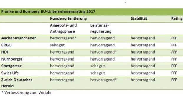 Wie bereits in den Jahren zuvor haben sich die BU-Versicherer Aachen Münchener, Ergo, HDI, Nürnberger, Stuttgarter, Swiss Life sowie Zurich Deutscher Herold den Analysten von Franke und Bornberg gestellt – und offenbar haben die Unternehmen ihre Hausaufgaben gemacht, denn alle untersuchten Gesellschaften wurden mit dem Top-Rating „FFF“ ausgezeichnet (siehe Grafik).