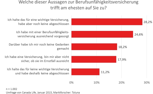 Erschreckend sind die Ergebnisse einer Umfrage des Versicherers Canada Life: 60 Prozent der Deutschen sind gar nicht abgesichert, 20 Prozent der Menschen mit Berufsunfähigkeitsversicherung wissen nicht, ob die versicherte Rente ausreicht.