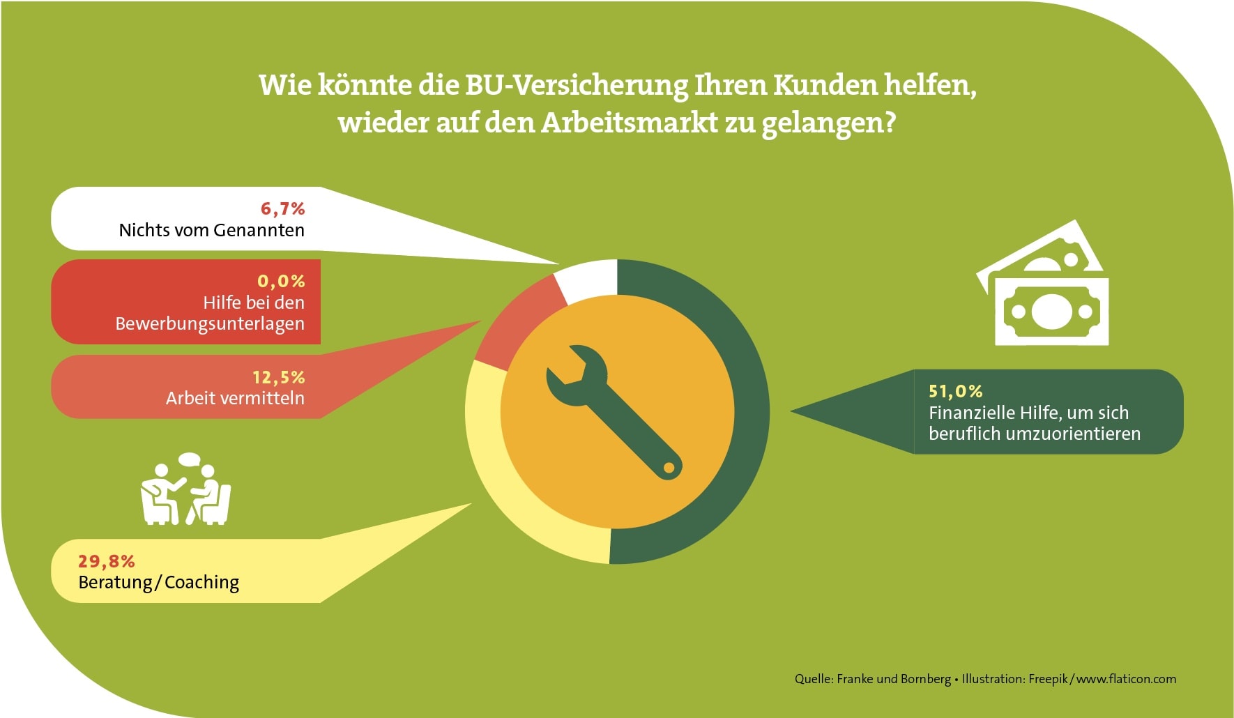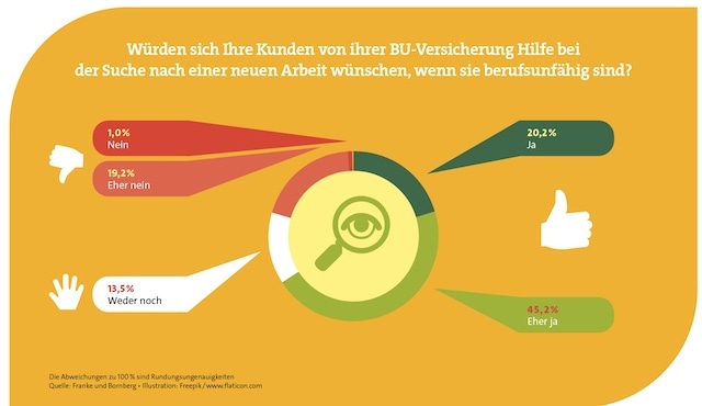 In die ähnliche Kerbe haut übrigens auch die ebenfalls enthaltene Gesundheitsplattform Coach:N. Sie bietet über 3.000 digitale Kurse darüber, wie sich Menschen gesund ernähren, bewegen und überhaupt verhalten können. Auch hier lautet die Rechnung für die Nürnberger: Sie steckt im Vorfeld Geld in solche Angebote, um später weniger Berufsunfähige zu haben. Eine Ansicht, die Makler übrigens mittragen, wie eine Umfrage der Rating-Agentur Franke und Bornberg zeigt. Darin geht es weniger um saubere Geldanlagen als vielmehr um das S in ESG, das Soziale. Einige Ergebnisse der Umfrage finden Sie in den Grafiken.