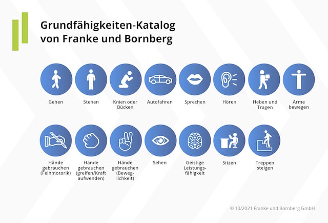 Seit dem ersten Rating im Jahre 2019 stellt Franke und Bornberg den verschiedenartigen Leistungsauslösern einen eigens entwickelten einheitlichen Katalog der relevanten Grundfähigkeiten gegenüber. Hier werden alle Leistungsdefinitionen der Versicherer fachlich eingeordnet – unabhängig davon, wie der jeweilige Versicherer die Fähigkeit bezeichnet.