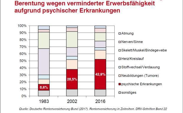 Psychische Probleme sind nach wie vor die Hauptursache für eine Berufsunfähigkeit. So zeigt eine aktuelle Auswertung des Versicherers Debeka, dass die Psyche in 41,8 Prozent der Fälle für die Berufsunfähigkeit verantwortlich ist. Dies deckt sich mit Zahlen der Deutschen Rentenversicherung Bund zur verminderten Erwerbsfähigkeit auf welche die Studienautoren hinweisen (siehe Grafik).