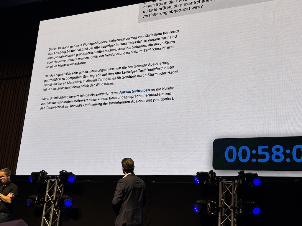 So ging es um einen Fall einer Kundin mit einer Wohngebäudeversicherung, die einen Schaden meldete: Ihre Solaranlage auf dem Dach wurde durch einen Sturm beschädigt. Statt jetzt nach dem Kunden im Maklerverwaltungsprogramm zu suchen und die Versicherungsbedinungen des Tarifs zu bemühen, spielten die beiden den Fall mit dem Chatbot durch.