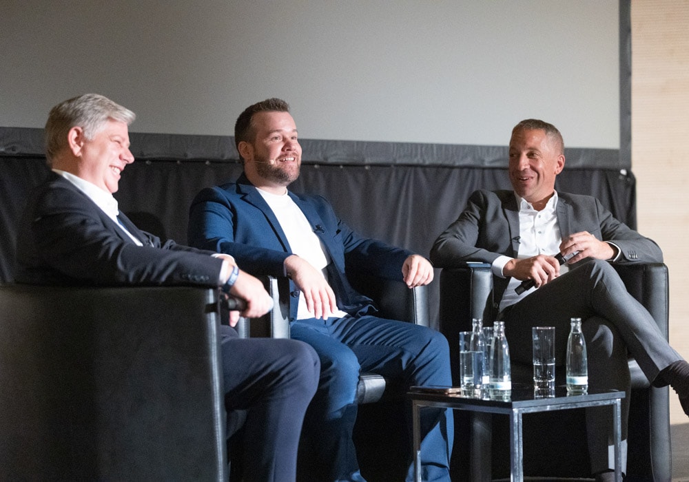 „Es wurde nichts gescriptet!“, also keine Fragen im Vorwege abgesprochen – mit dieser Vorwarnung leitete Moderator Stephan Peters (Bildmitte) das Streitgespräch ein, das Norbert Porazik (rechts) und Sascha Rabe, Direktionsleiter der Deutschen Vermögensberatung (DVAG), miteinander führten. Motto der Veranstaltung: „Versicherungsmakler & Vermögensberater – die Podiumsdiskussion“. Peters war selbst elf Jahre lang für die DVAG tätig, seit fünf Jahren steht er nun in den Diensten der Fonds Finanz und kennt daher beide Welten.