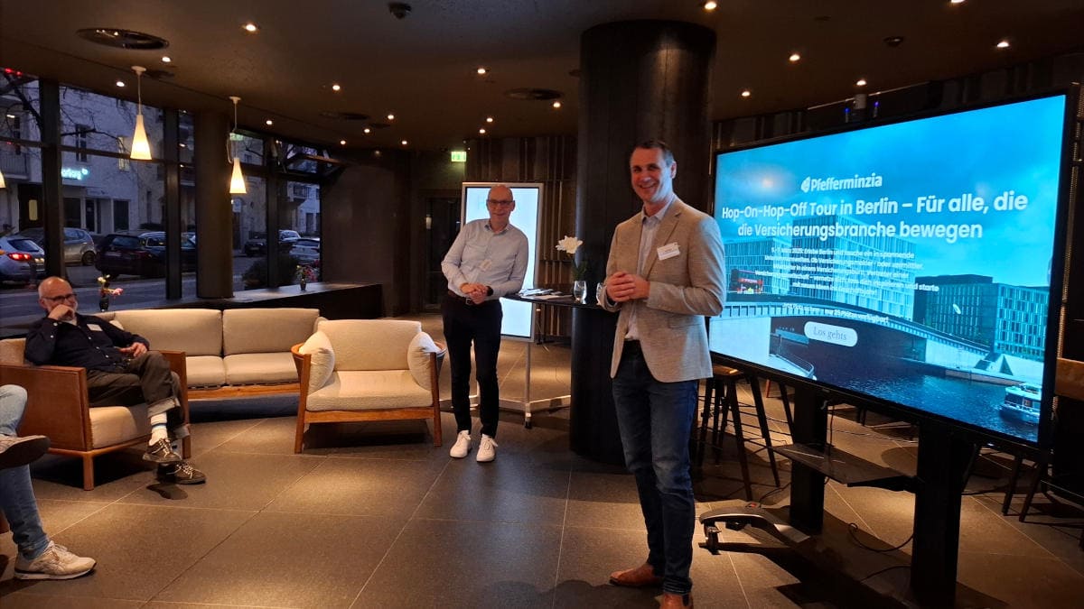 Pfefferminzia-Mitgesellschafter Jan Roß (vorn) begrüßt die Gäste der Hop-On-Hop-Off Tour im Sana Hotel in Berlin, nahe dem Kurfürstendamm. Im Hintergrund Pfefferminzia-Geschäftsführer Matthias Heß (Foto: Pfefferminzia)