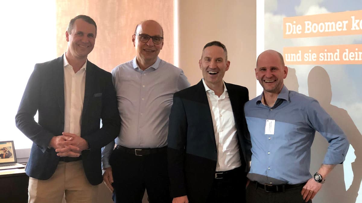 Gruppenfoto in den Räumen der Ideal: Vorstandschef Maximilian Beck (2. v. r.) mit Jan Roß (links), Matthias Heß (2. v. l.) und Andreas Harms von Pfefferminzia