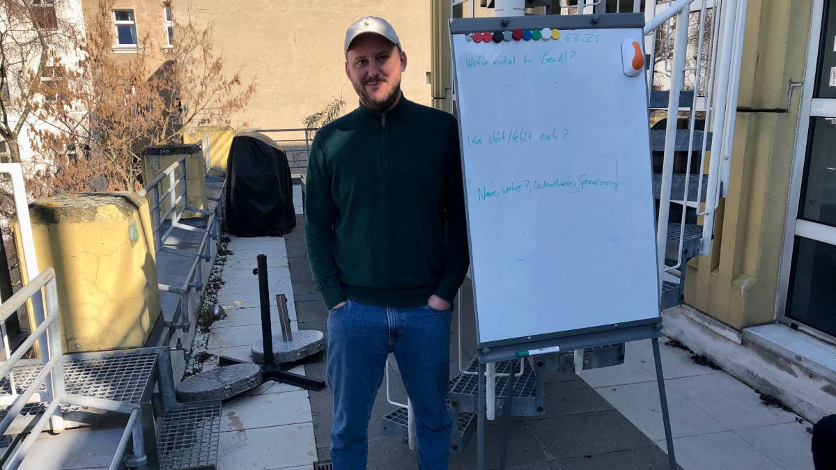 Muffintech-Chef und -Gründer Simon Moser schreibt auf einer Tafel mit, welche Erfahrungen seine Gäste mit künstlicher Intelligenz haben, und was ihnen noch fehlt