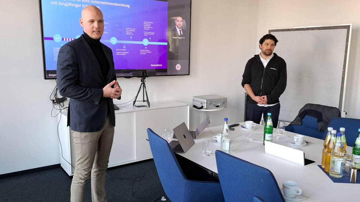 Joris Kunzner (links) und Gregor Ziegler von der Unternehmensberatung Bearingpoint erklären, wie die deutsche Vermittlerschaft mit Technik umgeht, und welche Technik ihr besser helfen könnte. Weitere Erkenntnis: Die Konsolidierung steht erst am Anfang, es werden also noch weitere Marktanteile auf große Makler konzentrieren (Foto: Pfefferminzia)