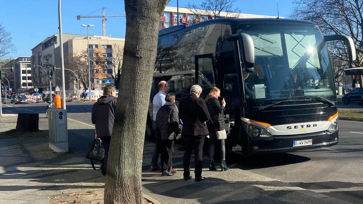 Da steht ein Bus vor der Tür: Die Hop-On-Hop-Off-Reisegruppe macht sich auf den Weg durch Berlin zu ihrem nächsten Gastgeber.