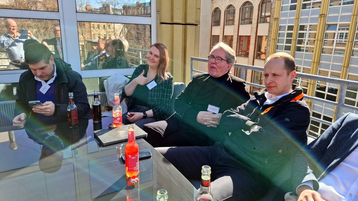Hop-On-Hop-Off-Gäste Wolfram Lefèvre (Digidor), Elisa Rohde (Rohde Beratung), Uwe Schumacher (Domcura) und Sebastian Empting (Zurich) (v.l.) auf der Dachterrasse von Muffintech lauschen dessen Gründer und Chef Simon Moser (Foto: Pfefferminzia)