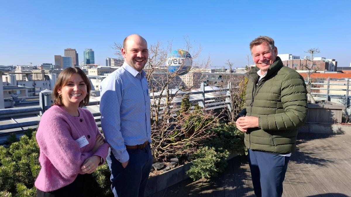 Ann-Kathrin Bockinac, Tim Euler (beide IDF Innovations- und Digitalisierungsfabrik) und Lars Gosch (Deutsche Bank) auf der Dachterrasse der Ideal Versicherung. Im Hintergrund: das Bundesfinanzministerium