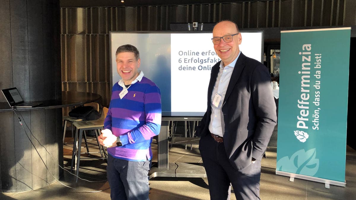 Wolfram Lefèvre von Digidor (links, mit Pfefferminzia-Geschäftsführer Matthias Heß), erklärte eindringlich und schlüssig, warum die eigene Homepage einem Makler definitiv nicht egal sein sollte. Und was alles zu einer guten Seite dazugehört, und was nicht (Foto: Pfefferminzia)