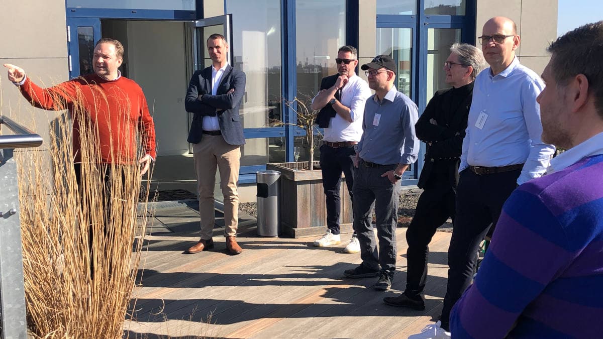 Hop-On-Hop-Off-Gäste Wolfram Lefèvre (Digidor), Elisa Rohde (Rohde Beratung), Uwe Schumacher (Domcura) und Sebastian Empting (Zurich) (v.l.n.r.) auf der Dachterrasse von Muffintech lauschen dessen Gründer und Chef Simon Moser
