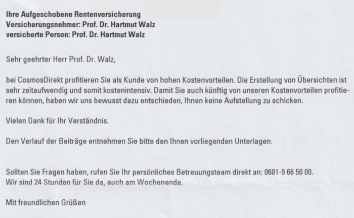 Vor über 20 Jahren hatte der Verhaltensökonom Hartmut Walz eine fondsgebundene Rentenversicherung beim Direktversicherer Cosmos Direkt abgeschlossen. 54.162,83 Euro Kapitalleistung standen nach Vertragsablauf zu Buche. Walz fand das enttäuschend und bat darum, eine Aufstellung seiner Beitragszahlungen zu erhalten, um den Vertrag nachrechnen zu können. Was er dabei erlebte, erfahren Sie hier.