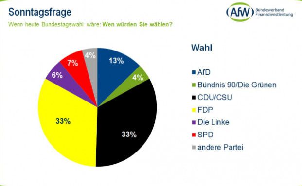 Das Wahlverhalten der Vermittler dürfte stark vom bundesdeutschen Durchschnitt abweichen. Das ergab die „Sonntagsfrage“, die der Branchenverband AfW im Rahmen seines 10. Vermittlerbarometers stellte.
