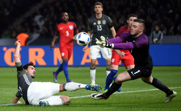 Verteidiger Mats Hummels (links) im Kampf gegen Englands Keeper Jack Butland beim Spiel England gegen Deutschland.