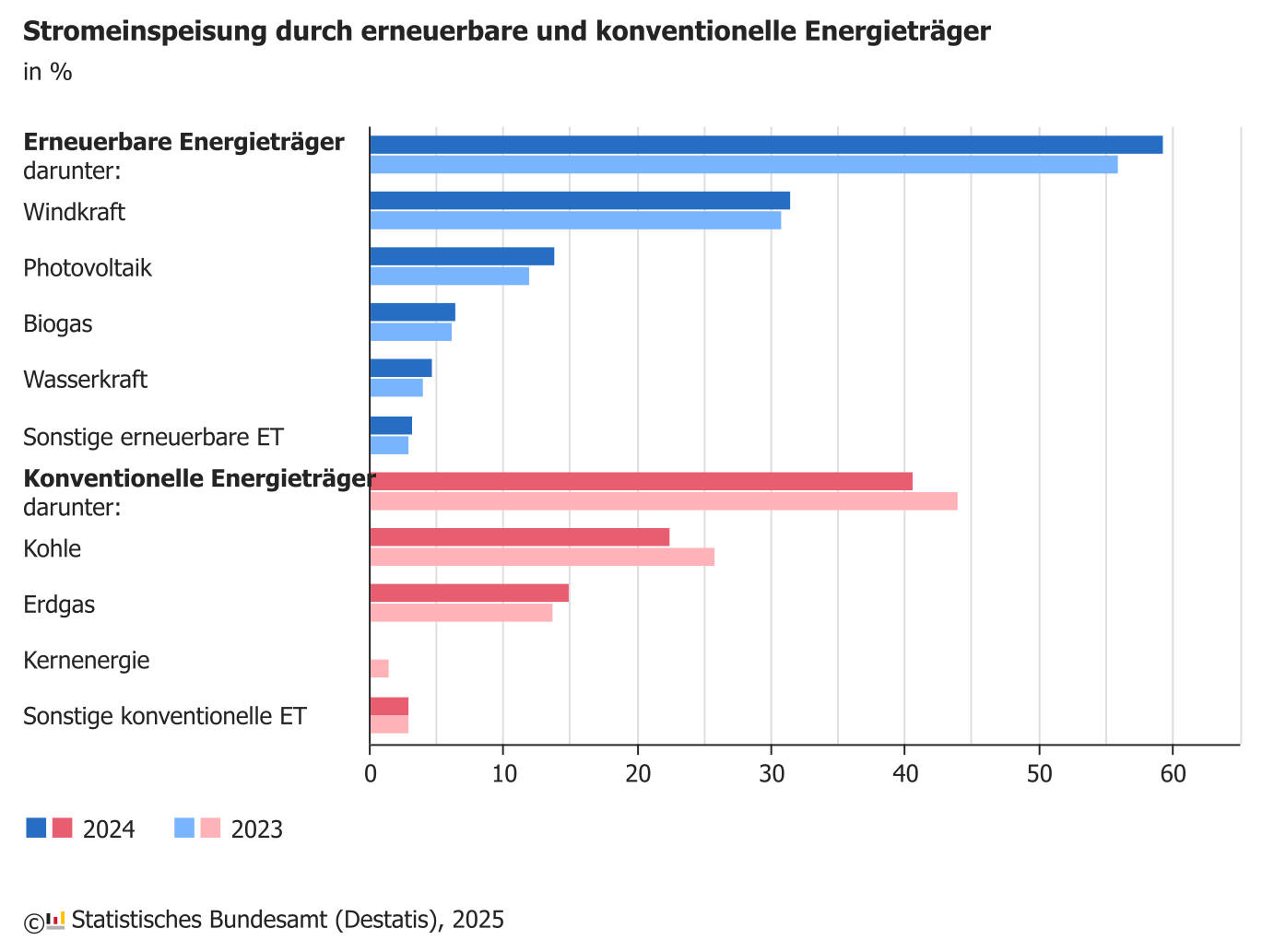 Die Menge des aus Photovoltaik erzeugten Stroms in Deutschland hat einen neuen Höchstwert erreicht. So flossen 2024 aus den entsprechenden Solarpanelen 59,5 Milliarden Kilowattstunden ins Netz. Das sind 13,8 Prozent der gesamten Stromproduktion und 10,4 Prozent mehr als im Vorjahr. Das meldet das Statistische Bundesamt (Destatis) (Mehr zur Photovoltaik finden Sie hier).