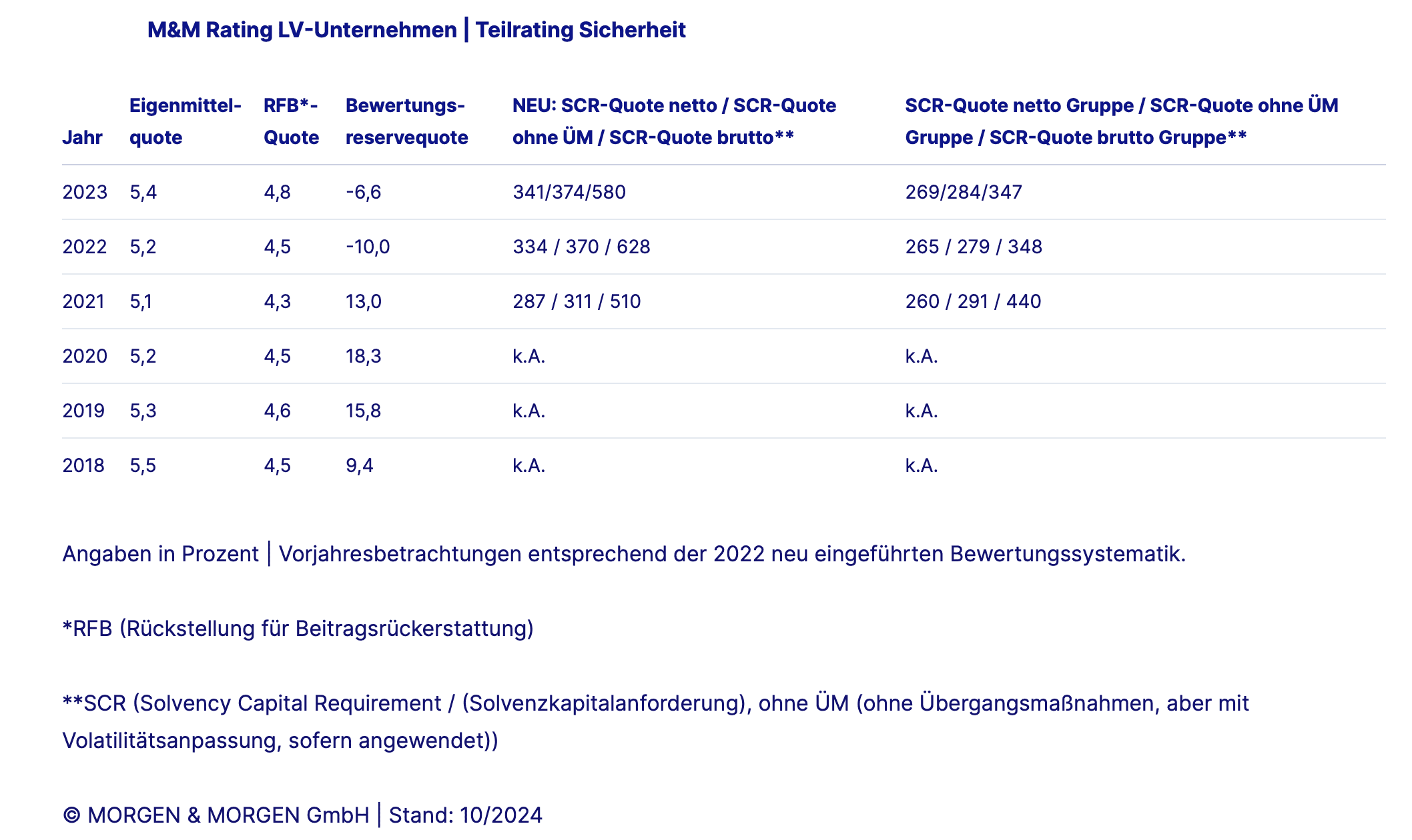 Anhand von fünf Kennzahlen schätzen die Analysten die finanzielle Stabilität und Eigenkapitalunterlegung eines Lebensversicherers im Krisenfall ein. Sie haben dafür im Teilrating Sicherheit die SCR-Bedeckungsquoten nach Solvency II herangezogen. Anhand der Quoten wird ersichtlich, inwiefern der Versicherer Solvenzkapitalanforderungen (Solvency Capital Requirement, SCR) durch Eigenmittel abdecken kann. Zusätzlich zu den Solvency-II-Quoten werden im Teilrating Sicherheit die Sicherheitsgrößen der HGB-Bilanz betrachtet.