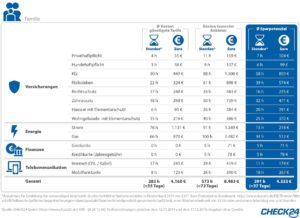 Berücksichtigt man neben Versicherungen auch die Kosten für Energie, Finanzen und Telekommunikation so ergäben sich für eine vierköpfige Familie insgesamt bis zu 8.483 Euro Jahresfixkosten, was einer Arbeitszeit von 3,5 Monaten entspräche. Wer Verträge regelmäßig überprüft und wechselt, kann laut dem Portal die Kosten auf bis zu 4.160 Euro pro Jahr reduzieren. Ein Single könnte seine Jahreskosten so von durchschnittlich 4.256 Euro (36 Tage) auf 1.970 Euro (17 Tage) senken.