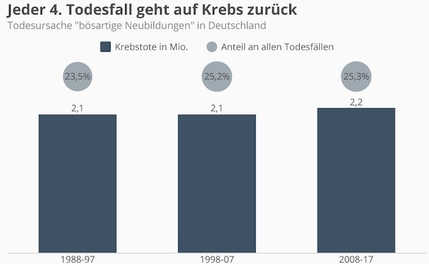 Von 2008 bis 2017 starben 2,2 Millionen Menschen hierzulande an Krebs. Jeder vierte Tod geht damit auf die Krankheit zurück – und das ist bereits seit 1992 der Fall. Das zeigen Zahlen des Statistischen Bundesamts.