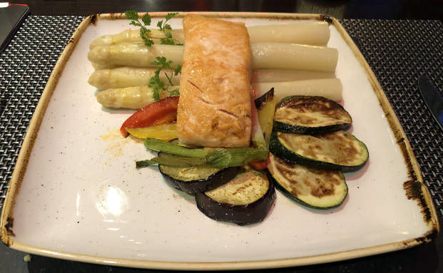 Nach meinem 7,5-Kilometer-Lauf sehe ich mich im Hotel und im dortigen Restaurant um. Das ist immer eine spannende Geschichte, denn oftmals besteht das Speisenangebot dort eher aus ungesunden Gerichten. Auch hier gibt es Burger & Co., allerdings auch Gesundes. Ich wähle vorab einen gemischten Salat (Blattsalate, Babyspinat, Gurken, Tomaten, Sprossen, Sonnenblumenkerne und grüner Spargel). Als Hauptspeise wähle ich Lachs mit Spargel. Die Petersilienkartoffel ändere ich in gegrilltes Gemüse um und statt der Sauce Hollandaise lasse ich mir etwas Butter reichen. Da morgen das Mittagessen wegen der Rückreise nach meinem Vortrag ausfällt, werde ich vermutlich frühstücken. Wenn ich Hunger habe. Ich bin gespannt, was hier zur Verfügung stehen wird. Abends im Zimmer habe ich Lust, etwas zu knabbern und entscheide mich für die kleine Packung Erdnüsse. Nicht optimal, da diese stark gesalzen sind. Es ist allerdings auch nur eine kleine Packung mit 30 Gramm, also nicht weiter tragisch.