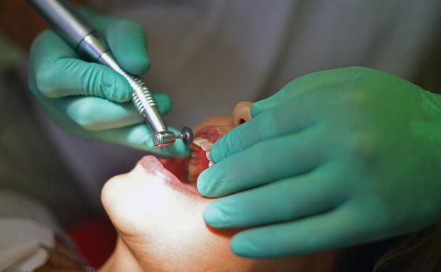 Einer Patientin werden von einem Zahnarzt herausgewachsene Zähne auf die selbe Länge geschliffen.