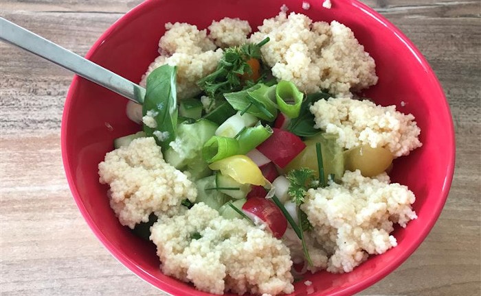 Hüttenkäse mit Gemüse und Couscous