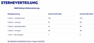 Ein aktuelles Rating von Morgen & Morgen zu Unfallversicherungen zeigt: Die meisten Tarife haben eine hohe Qualität. Laut dem neuesten Ergebnis erhielten 142 Tarife die Bestnote von fünf Sternen („ausgezeichnet“). Das sind sieben mehr als im Vorjahr.