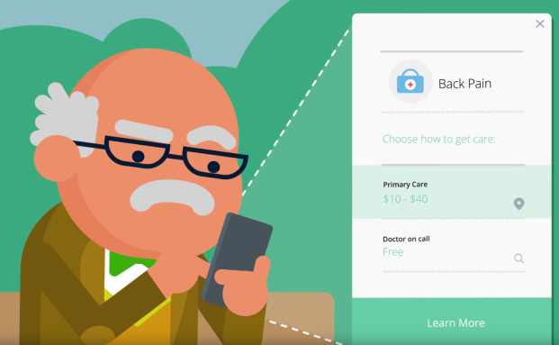 Szene aus einem Erklärvideo von Oscar: Der alte Mann hat eingetippt, dass er Rückenschmerzen hat. Jetzt erfährt er, was eine Erstbehandlung kostet.