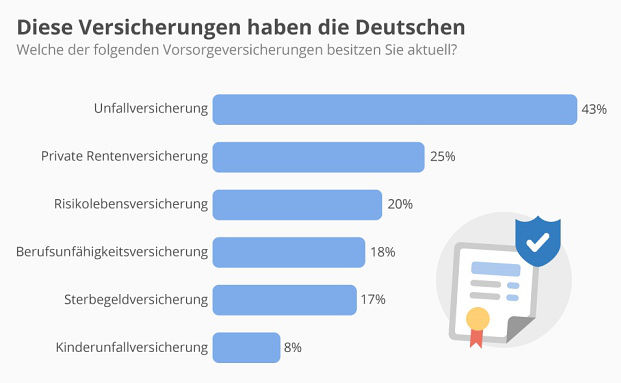 Geht es um Vorsorgeversicherungen greifen die Bundesbürger am ehesten zur Unfallversicherung – 43 Prozent haben ein solches Produkt. Das zeigt eine aktuelle Umfrage des Datenportals Statista. Die Berufsunfähigkeitsversicherung indes findet man nur in rund jedem fünften Versicherungsordner in Deutschland.