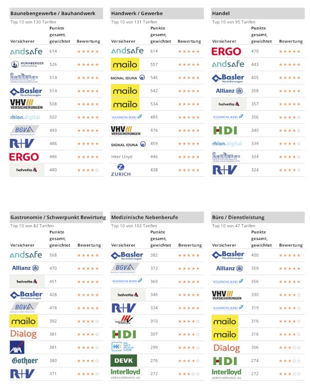 Insgesamt wurden für das Ranking die Bedingungen von über 25 Versicherern zu den Branchen Bauhaupt- und Baunebengewerbe, Handwerk, Handel, Dienstleistung, Gastronomie und medizinische Nebenberufe geprüft. Dabei wurden auch neue Kriterien in die Bewertung aufgenommen, wie etwa die Eignung eines Produkts für den Online-Vertragsabschluss in einem Portal. „Erstmals vergeben wir auch ein Qualitätssiegel für Produkte, die in unserem Rating 5 von 5 möglichen Sternen erreicht haben“, erläutert Wiemann.