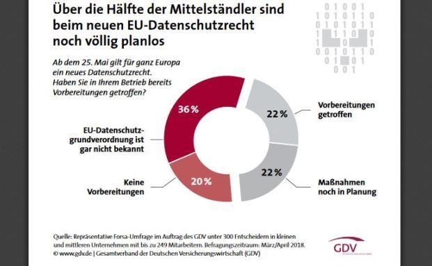 Bei kleinen und mittelständischen Unternehmen herrscht aktuell noch ein großer Nachholbedarf in Sachen Datenschutzrecht – obwohl die Datenschutzgrundverordnung (DSGVO) Ende Mai „scharf geschaltet“ wird, ist jeder zweite Mittelständler noch nicht darauf vorbereitet, wie eine aktuelle Umfrage des Versicherungsverbandes GDV zeigt.